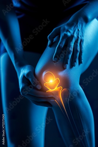 Representation of a woman feeling severe knee pain. A woman pressing his knee with his hands because of knee inflammation.