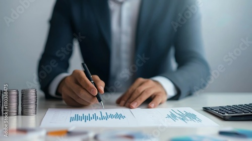 representing ROI financial strategies concept. Business Professional Analyzing Financial Data with Graphs and Charts on Desk