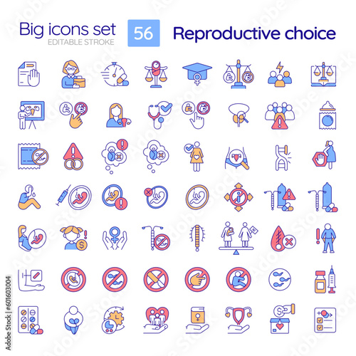 Reproductive choice RGB color icons set. Women empowerment. Reproductive health. Human right. My body. Isolated vector illustrations. Simple filled line drawings collection. Editable stroke