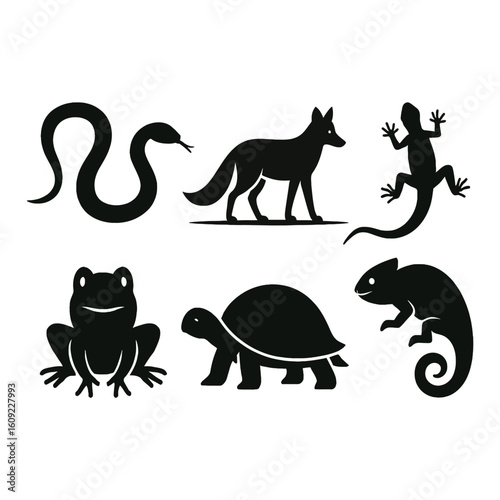 Reptile and amphibian silhouette icons with snake, lizard, frog, fox, turtle, and chameleon