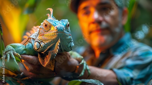reptile care, an experienced reptile keeper feeds an inquisitive iguana in a climate-controlled terrarium with specialized lighting, inside a well-maintained reptile room