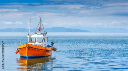 Rescue Boat with Life Buoy on Calm Blue Sea Amidst Seagulls