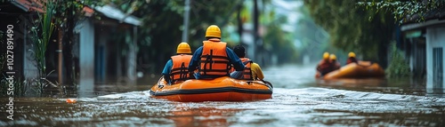 Rescue team navigates flooded streets in orange rafts, demonstrating bravery and teamwork during a natural disaster.