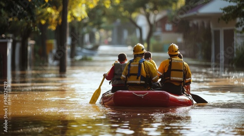 Rescue workers helping a family evacuate their flooded home with water rising around them