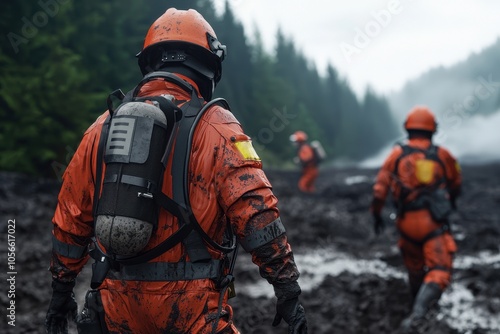 Rescue workers in orange suits navigating a muddy terrain in a forested area.