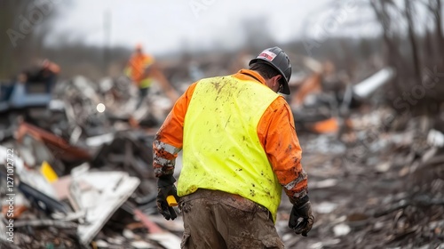 Rescue workers searching through tornado debris, using flashlights and equipment to locate survivors.