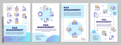 Research and development management blue circle brochure layout. Innovations. Leaflet advertising design with color line icons. Editable 4 pages. Arial-Bold, Myriad Pro-Regular fonts used