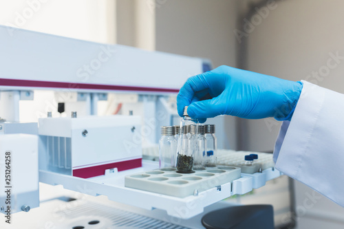 Researcher, scientist, physicist or laboratory assistant working, experimenting and analyzing in modern lab with equipments, tools and machines.