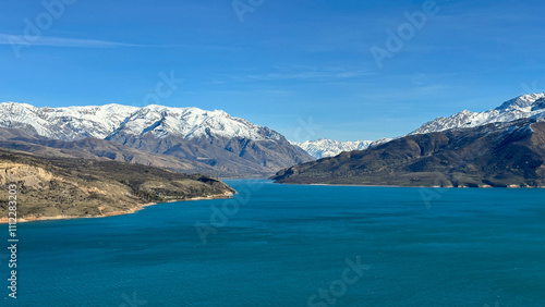 reservoir in the mountains with snowy peaks