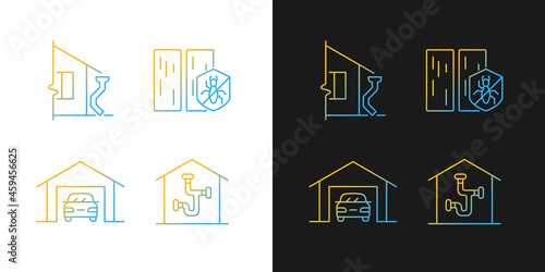 Residential construction gradient icons set for dark and light mode. Roof drainage system. Thin line contour symbols bundle. Isolated vector outline illustrations collection on black and white
