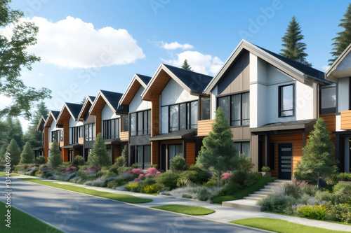 Residential street lined with contemporary townhouses featuring sleek architecture, lush landscaping, and a peaceful neighborhood atmosphere