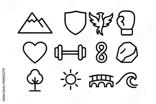 Resilience Icon Grid. Outline icon set of resilience: mountain, shield, phoenix, boxing glove, heart, dumbbell