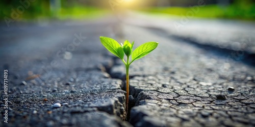 Resilience in Urban Landscapes: A Green Sprout Breaking Through Asphalt Cracks