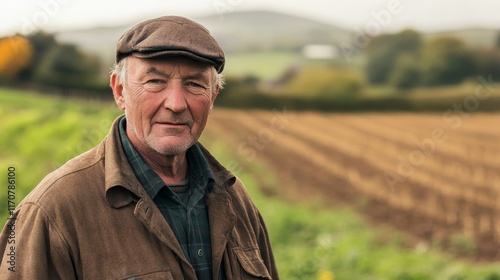 Resilient Irish Farmer: Aged 60s Man with Determined Expression in Rural Field under Soft Light