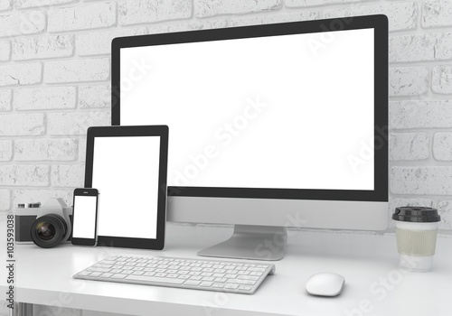 Responsive mockup screen. Monitor, tablet, phone on table in office.