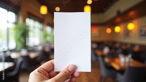 Restaurant interior with tables, blurred people. Mock-up for eatery promo material. Template for pamphlet leaflet design.
