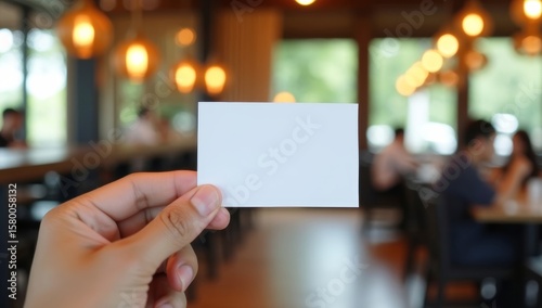 Restaurant interior with tables, blurred people. Mock-up for eatery promo material. Template for pamphlet leaflet design.