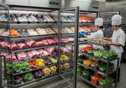 Restaurant kitchen cold storage area with chefs carefully organizing seafood, meat, and vegetables in walk-in refrigerators for preservation