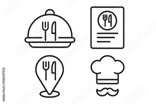 Restaurant Line Icons Set. Vector Outline Food Service Symbols: Cloche, Menu, Location Pin, Chef Hat, Mustache. Modern Minimalist Design for Web, App, Branding, Hospitality, Culinary, Editable