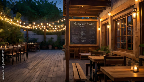 Restaurant space Dark wood counter. interior candle restaurant at night bokeh background