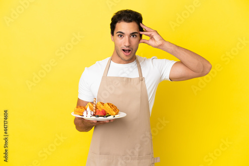 Restaurant waiter holding waffles over isolated yellow background with surprise expression