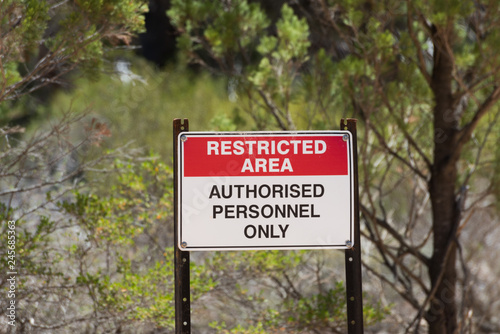 Restricted Area, Authorised Personnel Only - safety warning sign for not trespassing on blurred background