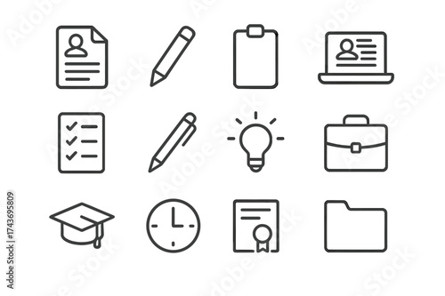 Resume Icon Set. Resume Building. Line icon set of Resume Building: resume, pencil, clipboard, laptop, checklist, pen, light bulb, briefcase, graduation cap,