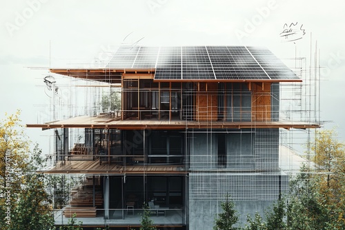Retail complex balcony architecture illustration featuring photovoltaic plan overlay gentle detail shot