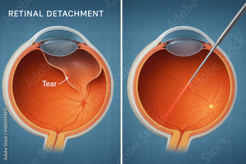 Retinal Detachment Repair Illustration: Before and After Laser Treatment, Eye Anatomy, Ophthalmology [Illustration]