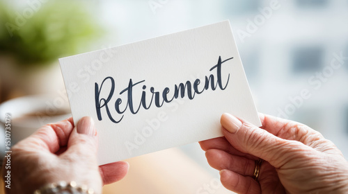 Retirement card held by elderly hands with soft natural light creating warm feeling perfect for retirement party celebration or announcement in cozy indoor setting
