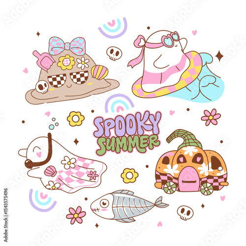 Reto groovy little ghost in spooky summer elements isolated on white background. Vector illustration.