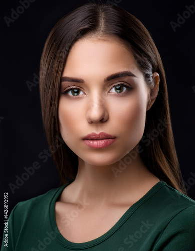 Retrato artistico de una mujer joven morena guapa con piel perfecta y mirando de frente aislada en un fondo negro