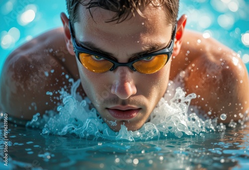 Retrato de cerca de nadador masculino apuesto en movimiento