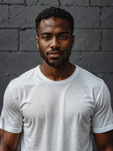 Retrato de un hombre joven negro y apuesto vistiendo una camiseta blanca de algodón
