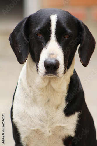 Retrato Perro blanco y negro mirando seriamente a la camara