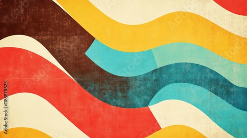 Retro 70s Striped Pattern: Vintage Coral Red, Turquoise Blue, Brown & Cream Yellow Curved Lines with Distressed Texture - Minimalist Geometric Design for Posters