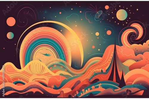 retro and vintage psychedelic poster with dreamy night sky, stars, and moon, created with generative ai
