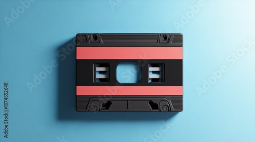 Retro black cassette tape with red stripes against a vibrant blue background, evoking nostalgia.