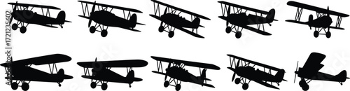 Retro Black Silhouette Biplane Set, Vintage Aircraft Designs, Ideal for Aviation Art Projects, 20 Unique Styles