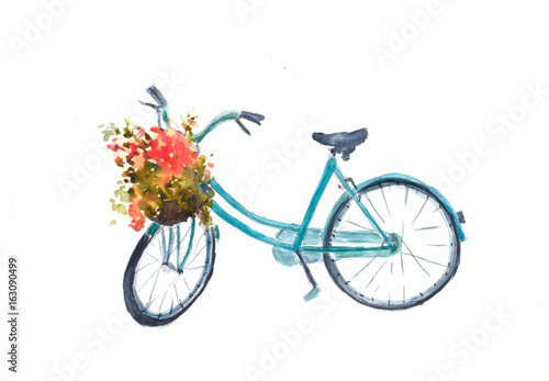 Retro blue bicycle with flowers in basket on white background, watercolor illustrator