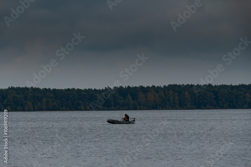 Retro boat in a misty lake. Fog in Shatsky lake, Ukraine. High resolution photo.