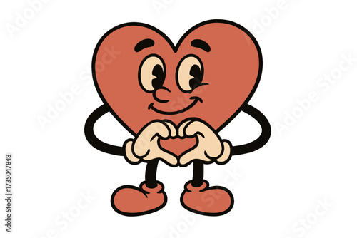 Retro cartoon heart character making a heart shape with hands. Cute vintage mascot with a smiling face. Love gesture symbol for Valentine's day. Nostalgic 30s comic style vector.
