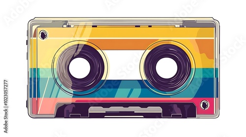 Retro cassette tape with colorful label and clear casing, positioned against a white background, evoking a sense of nostalgia and vintage charm from past decades