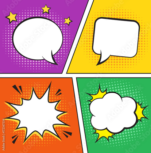 Retro comic empty speech bubbles set on colorful background. Vector illustration, vintage comic design, pop art style.
