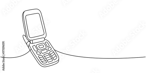 Retro flip mobile phone one line continuous drawing. Old communication gadgets. Vector linear illustration.
