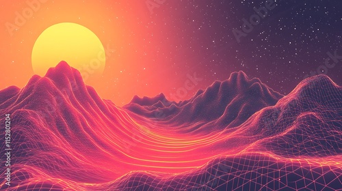 Retro Futuristic Digital Landscape: Vividly Rendered Synthwave Mountain Range at Sunset. AI Generated