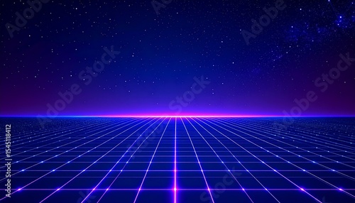 Retro Futuristic Grid Landscape with Neon Lights and Starry Sky.