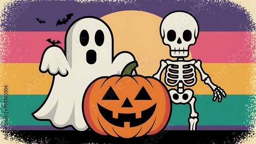 Retro Halloween illustration with a ghost, skeleton, and jack-o-lantern against a sunset backdrop. Perfect for festive designs, social media, and print projects.