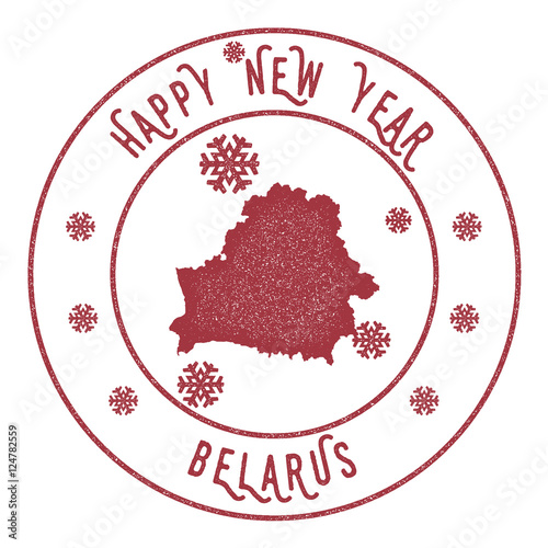 Retro Happy New Year Belarus Stamp. Stylised rubber stamp with county map and Happy New Year text, vector illustration.