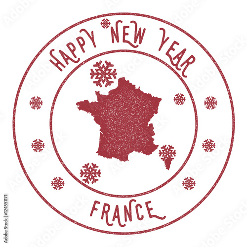 Retro Happy New Year France Stamp. Stylised rubber stamp with county map and Happy New Year text, vector illustration.